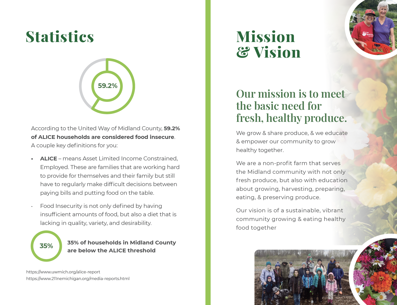 B: In 2018 I decided to focus on the health of my family and the work of caring for our 4 children. I stopped formally working as a Nurse Practitioner. I was driven by a desire to go back to my roots and try to grow the vegetables we need for our family. We started a 500 square foot raised bed garden in our yard. Along with a desire to grow vegetables for my own family, my desire for everyone to have fresh local vegetables has grown. As a Family Nurse Practitioner, I worked in Women's Health in Midland for 6 years doing wellness exams and I found many people struggled with my recommendations for increasing vegetable intake due to lack of knowledge and resources. I learned that hunger is not a distant theoretical problem, but food insecurity is a problem that affects 1 out of 3 families in Midland County. One out of three families have to make difficult decisions between paying bills and purchasing food for their families. Many people have trouble affording fresh produce on their budgets. It is sad that the best food for our bodies is often considered a luxury, one that not all can afford.