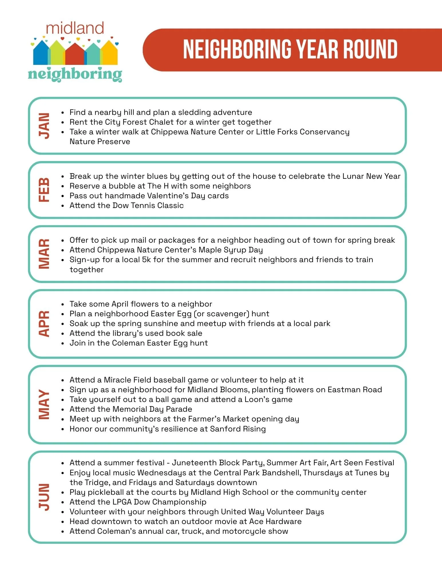Neighboring Week is organized by Midland Neighboring, a subcommittee of the Midland Area Cultural Awareness Coalition, which is an initiative of the Midland Area Community Foundation.
