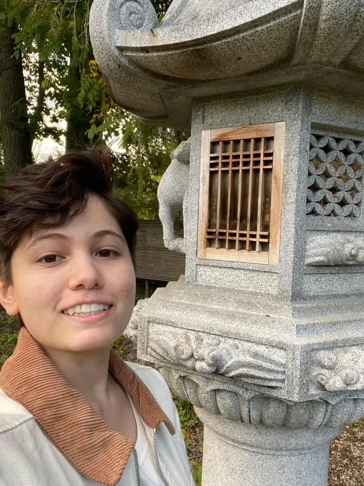 Sof Berlanga takes a selfie with a lantern for the Public Arts Midland Scavenger Hunt. This lantern is a piece of art donated by our sister city, Handa, Japan in 1991, located at the Grace A. Dow Library
