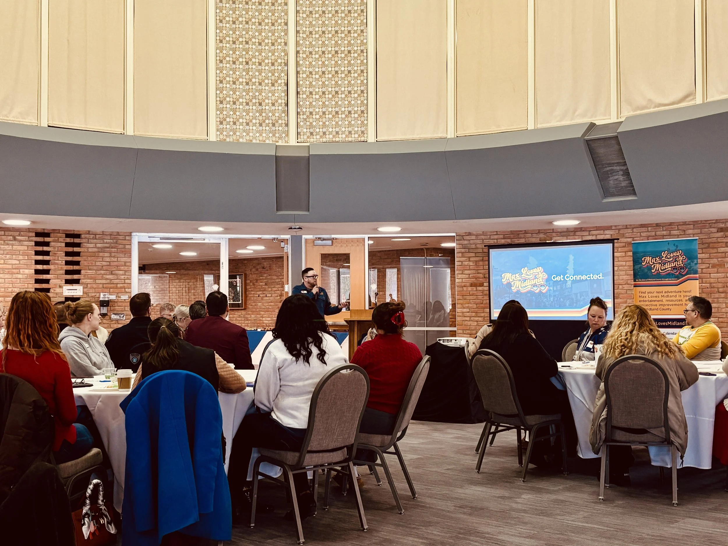 Kevin LaDuke closed the speaker portion with an update on Max Loves Midland. He shared the origins of Max, which grew out of the Communities of Excellence process and the need for a stronger mechanism to connect the work of the Community Success Panel with the broader community. Kevin highlighted milestones from the year, including significant growth in website traffic, nearly six thousand community events submitted to the calendar, continued success of the Max Loves Midland Show, and strong local engagement with stories and resources. Upcoming plans include new partnerships, expanded content, AI-supported tools, and future enhancements designed to help every resident feel connected to the county.