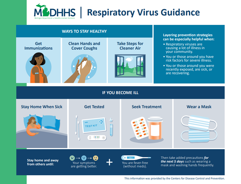 The Respiratory Virus Guidance provided by the Michigan Department of Health and Human Services (MDHHS) outlines steps to stay healthy, and what to do if you become ill: